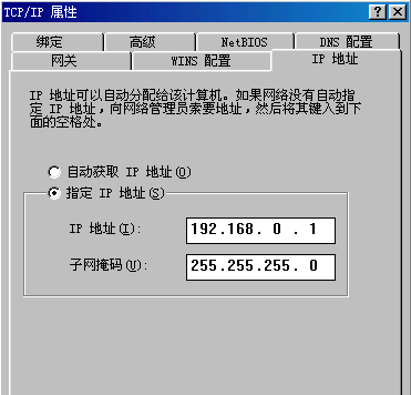 选定TCP/IP��〉Reltek 8209 PCI Ethernet NIC,然后单击“属性” 项,显示TCP/IP属性菜单,选择IP地址页,选择“指定IP地址”,填入“192.168.0.1”,子网掩码填入“255.255.255.0”,然后关闭TCP/IP属性菜单。如下图所示。