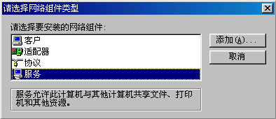 返回网络属性菜单配置页,单击“添加”,显示“请选择要添加的网络组件类型”,选择“服务”,单击“添加”,选择“Microsoft网络上的文件与打印机共享”,单击“确定”。退出。
