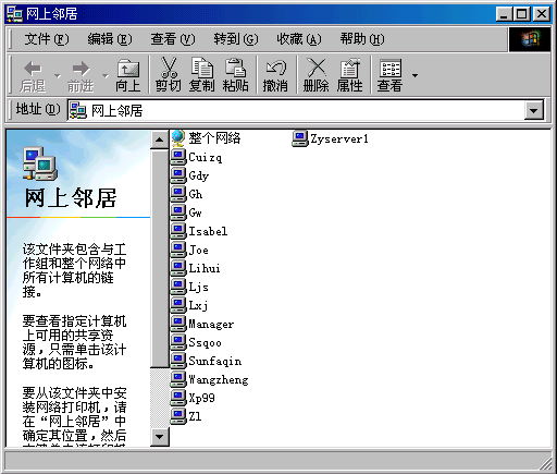 所有计算机的网卡安装、配置完成后,在任何一台计算机的桌面双击“网上邻居”图标,显示所有其它已经连接在网络中的计算机。如下图: